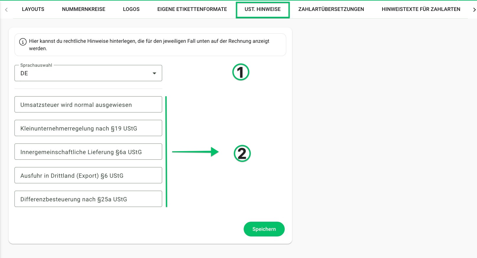 - Sprache: Im Drop-Down-Menü kannst du die entsprechende Sprache auswählen, für welche du USt. Hinweise anlegen möchtest. Diese werden entsprechend der im Kunden hinterlegten Sprache automatisch übernommen. Du siehst hier nur die Sprachen, welche du vorab unter Einstellungen / Sprachen hinterlegt hast.