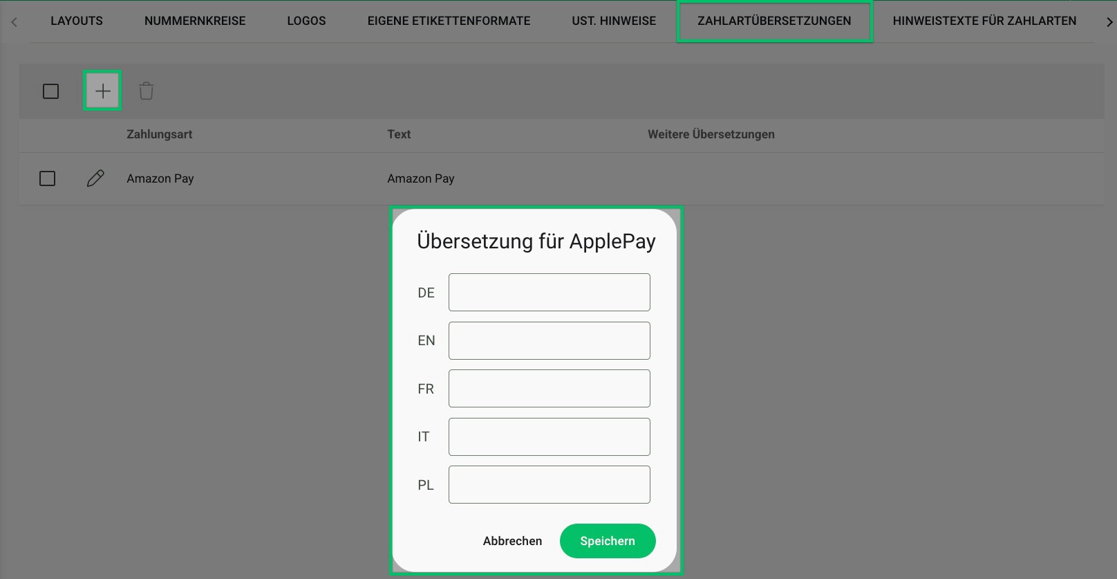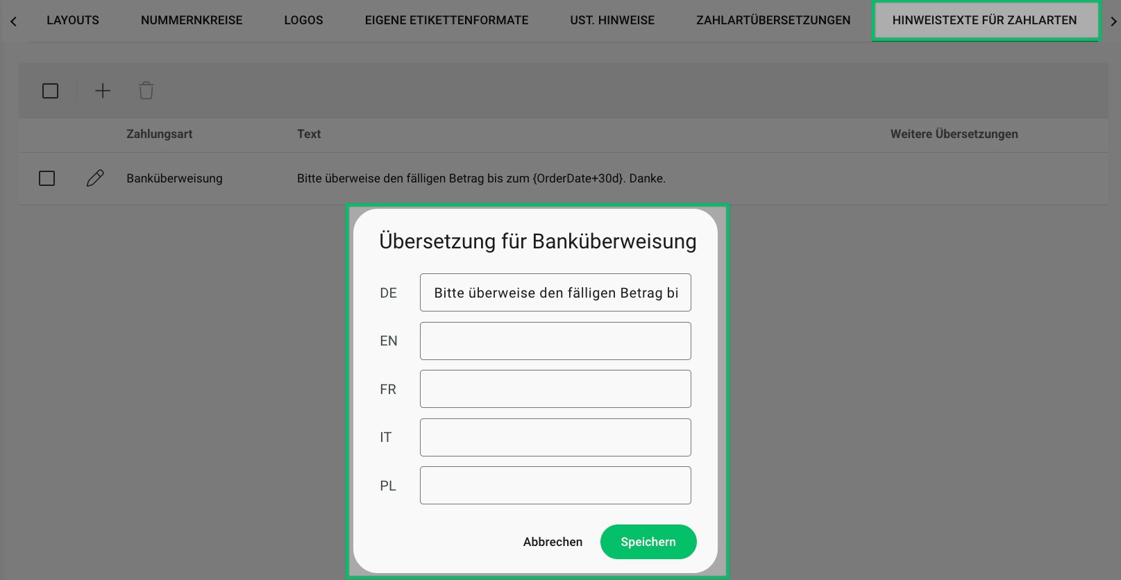 Nutzt du für deine Auftragsdokumente verschiedene Sprachen, hast du hier die Option, auch deine Zahlarten in andere Sprachen zu übersetzen: