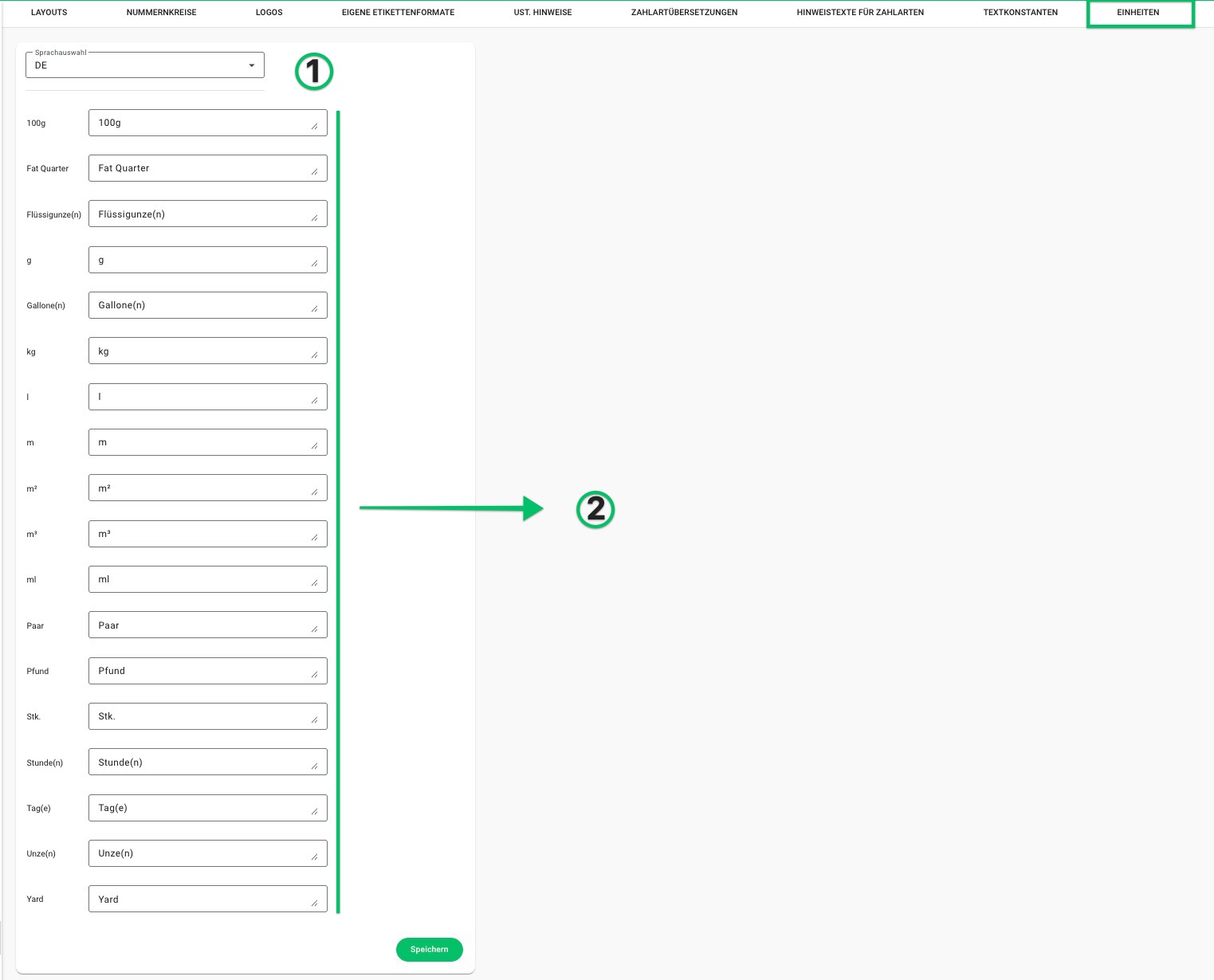 - Sprache: ber das Drop-Down-Menü kannst du die Sprache auswählen, für welche du Einheitsangaben anlegen möchtest. Diese werden dann entsprechend der im Kunden hinterlegten Sprache automatisch übernommen. Du siehst hier nur die Sprachen, welche du vorab unter Einstellungen / Sprachen hinterlegt hast.
