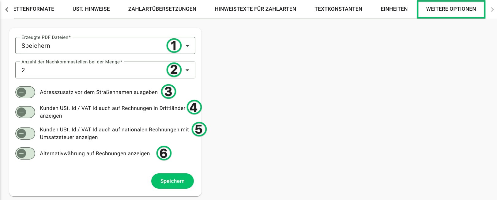 Es gibt noch ein paar mehr Einstellungsmöglichkeiten für deine Auftragsdokumente, welche du im Reiter "Weitere Optionen" findest: