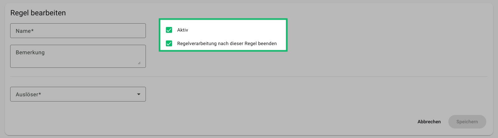 Regelverarbeitung nach dieser Regel beenden: Gibt es mehrere Regeln mit dem gleichen Auslöser, dann werden sie in der von dir definierten Reihenfolge ausgeführt (siehe Priorität). Setzt du allerdings bei einer dieser Regeln den Haken bei "Regelverarbeitung nach dieser Regel beenden" und treffen die Bedingungen dieser Regel zu, mit dem Resultat, dass die Regel ausgeführt wird, dann endet nach der Ausführung dieser Regel die gesamte Ausführung. Alle weiteren Regeln mit geringeren Prioritäten werden dann nicht mehr verarbeitet, d. h., nicht ausgeführt. Das ist z. B. sinnvoll, wenn es mehrere Regeln für einen Benachrichtigungstext gibt (unterschiedliche Sprachen / unterschiedliche Texte), um zu verhindern, dass mehrere Benachrichtigungen gesendet werden.