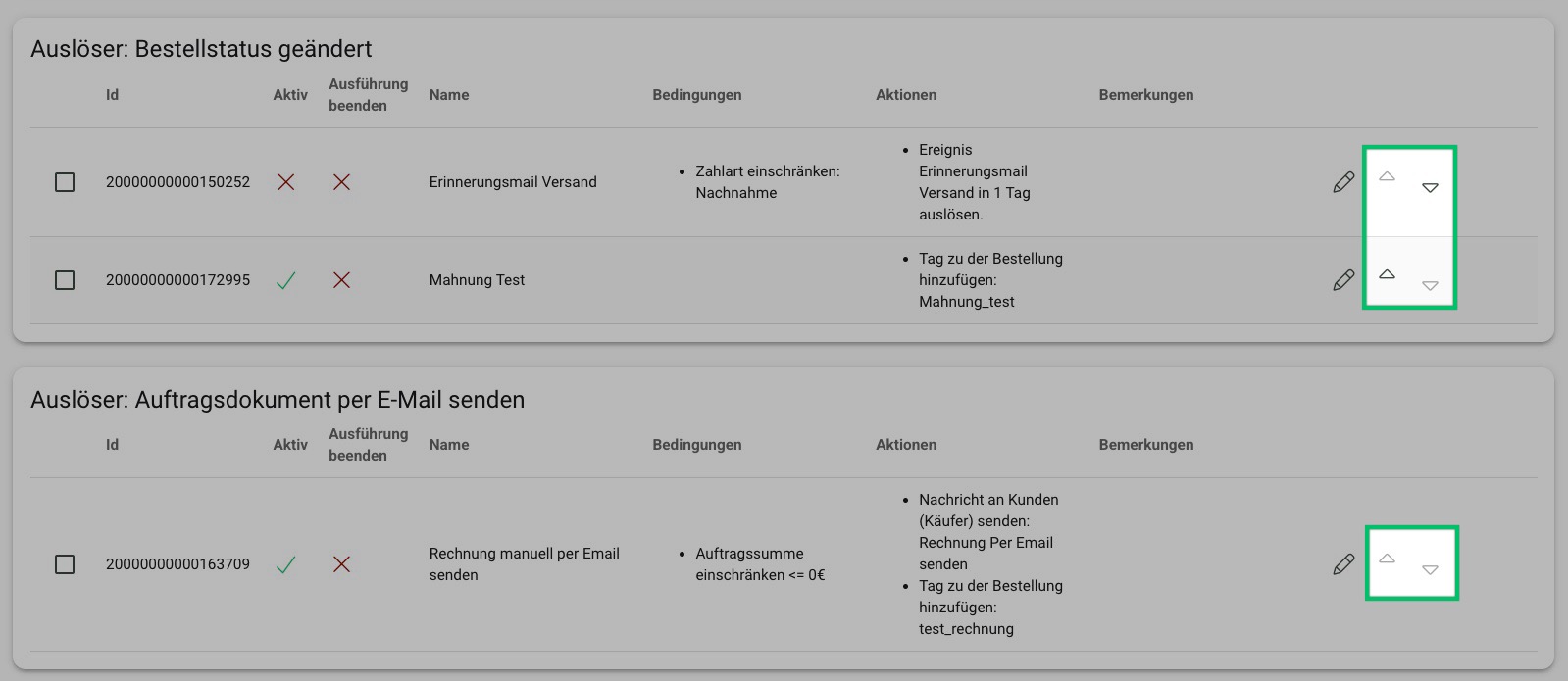 Priorität: Die Priorität legt fest, in welcher Reihenfolge Regeln mit dem gleichen Auslöser ausgeführt werden. Die Priorität der Regeln kannst du über die Pfeile rechts in der Regelübersicht ändern.