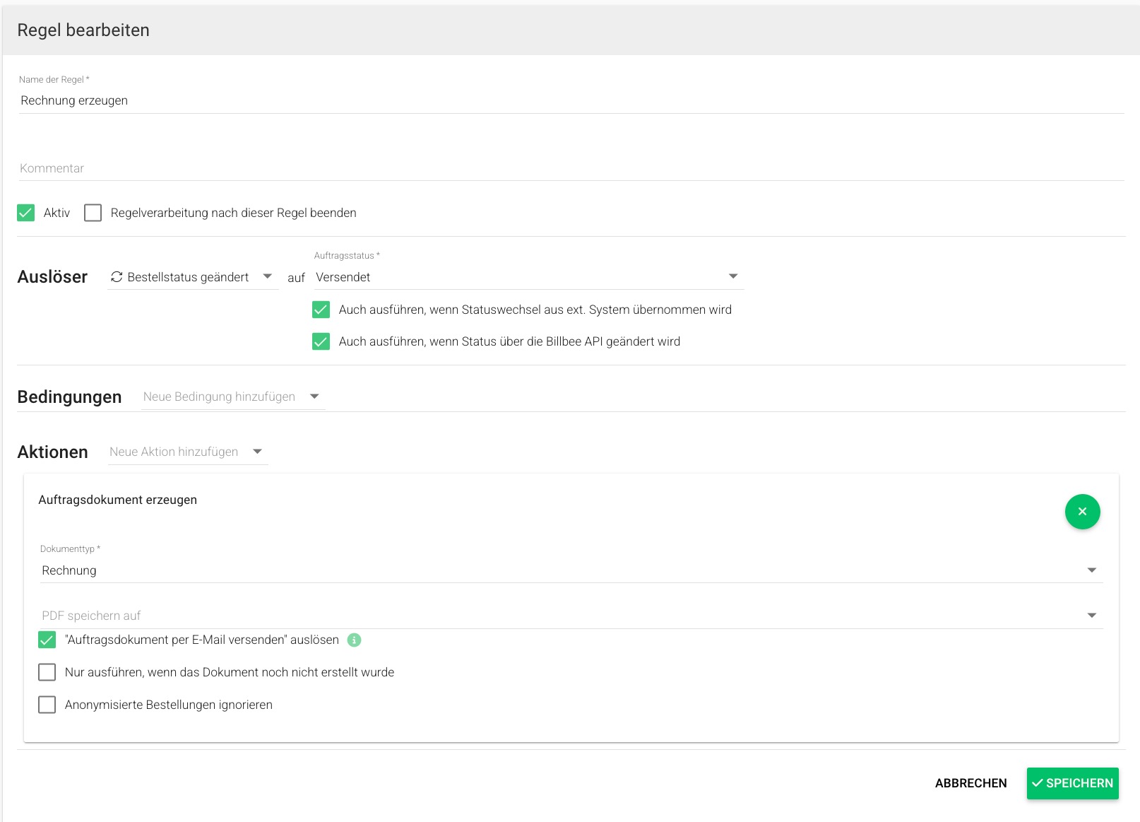- Regel, mit der die Rechnungen bei Statuswechsel erzeugt werden