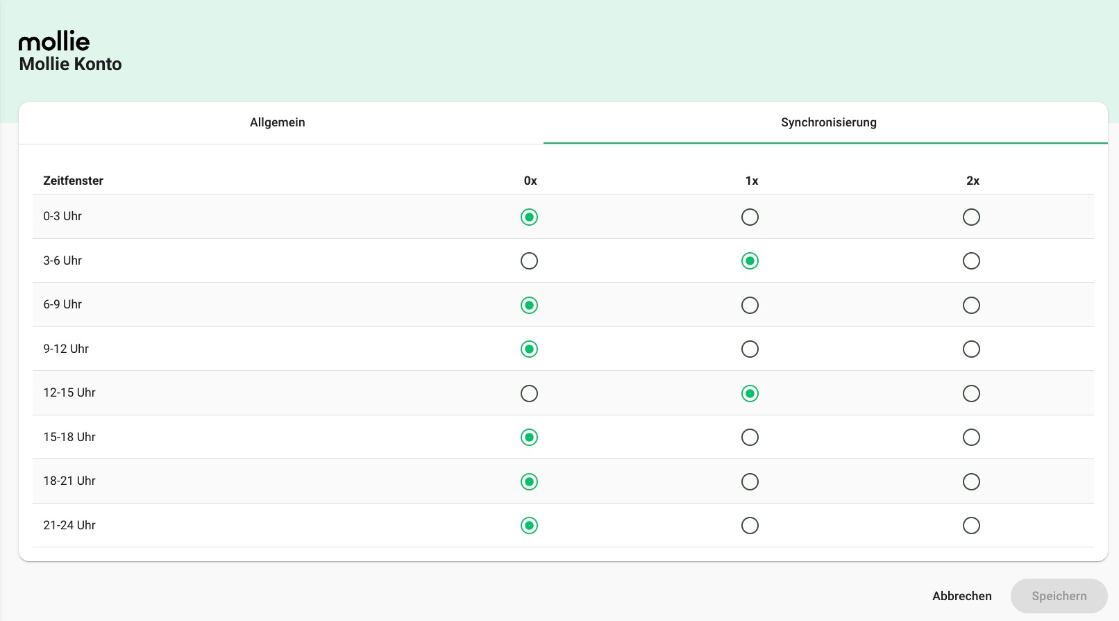 Voreingestellt sind hier die im Screenshot zu sehenden Intervalle. Möchtest du, dass die Zahlungen aus deinem Mollie Konto öfter oder weniger oft abgerufen werden, kannst du dies entsprechend einstellen.