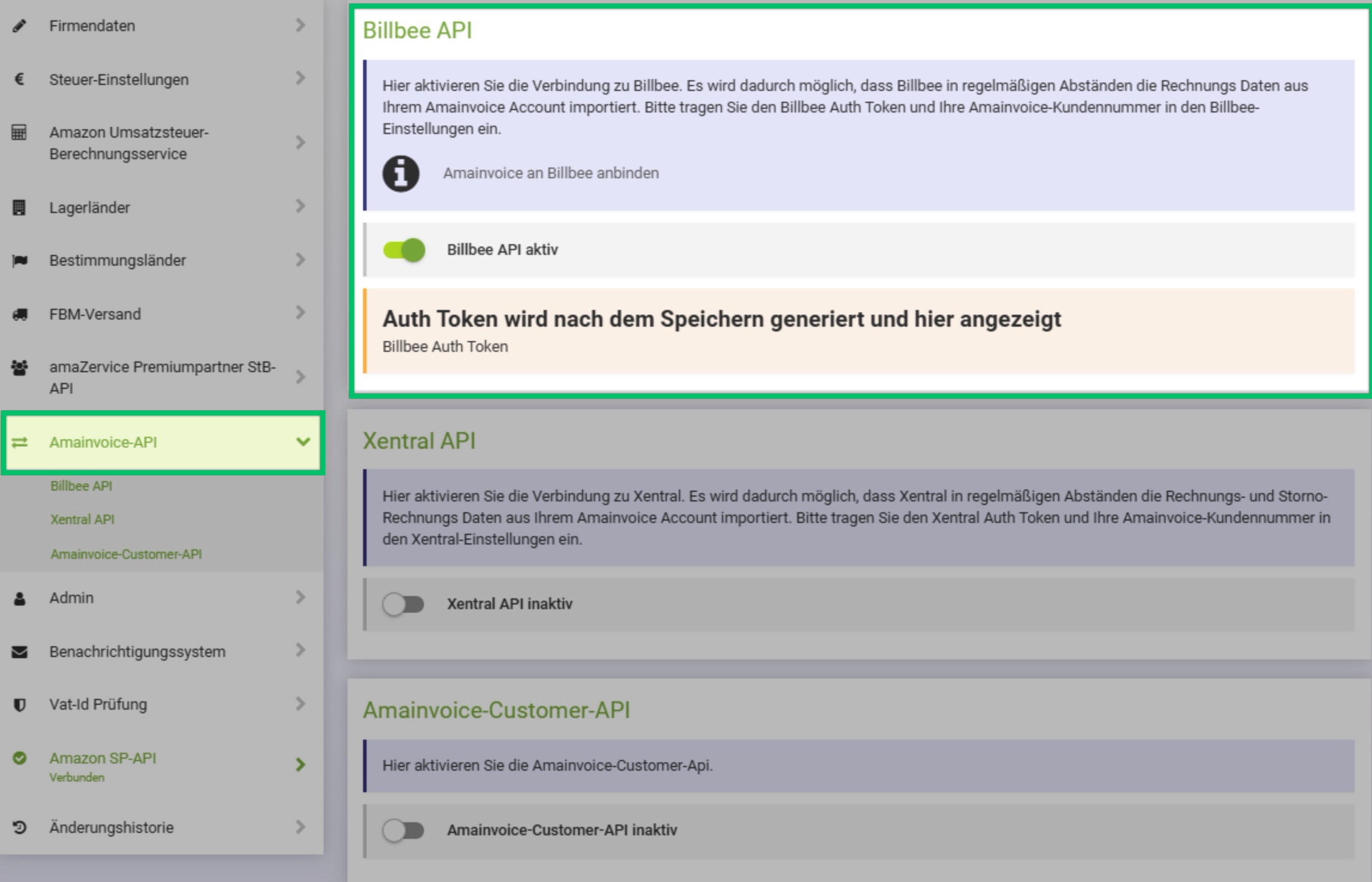 - Gehe über Firmenstammdaten zu Amainvoice API