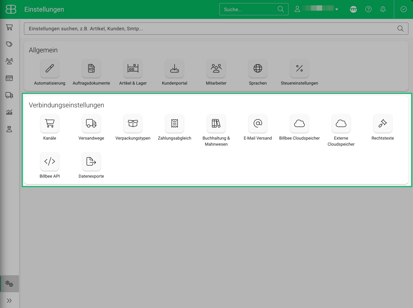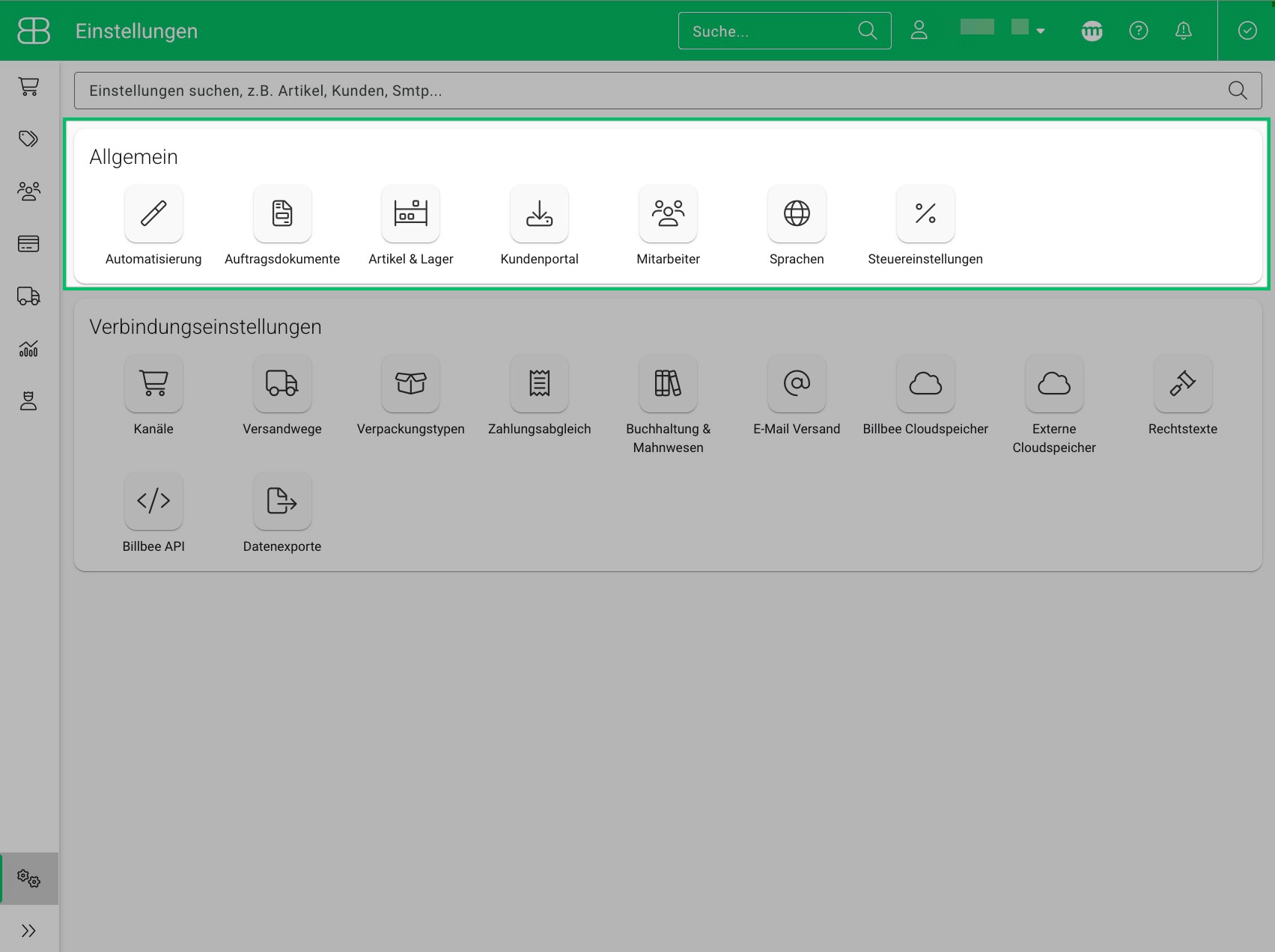 In diesem Bereich findest du alle Menüpunkte zu generellen Einstellungsmöglichkeiten in Billbee.
