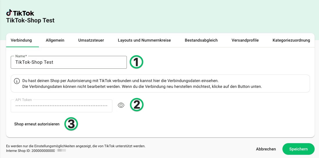 In den Einstellungen deiner TikTok Anbindung unter dem Reiter "Verbindung" findest du den Button 'Shop erneut autorisieren'. Mit einem Klick auf den Button öffnet sich ein Pop-Up Fenster, in welchem du die Reautorisierung vornehmen kannst. Anschließend speicherst du die Anbindung.