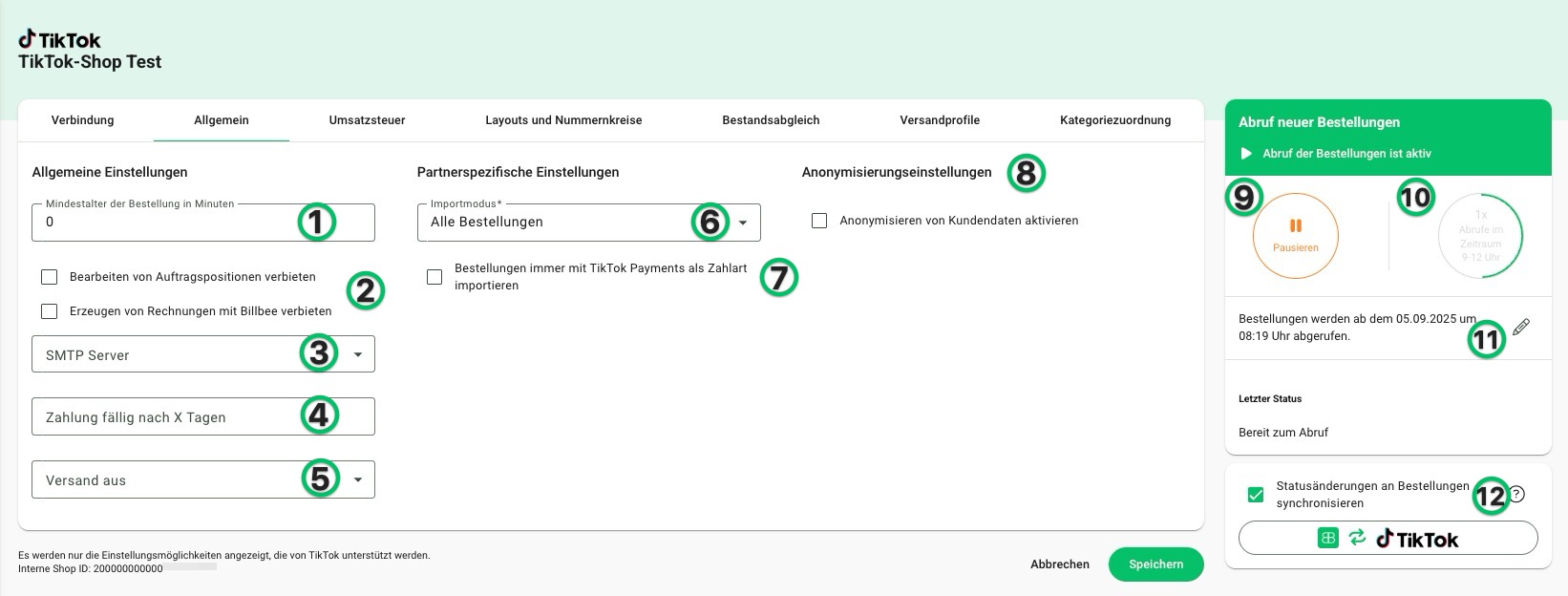 Um alle allgemeinen Einstellungen zu deiner TikTok Shopanbindung vorzunehmen, musst du in den Reiter "Allgemein" navigieren. Hier findest du folgende Optionen: