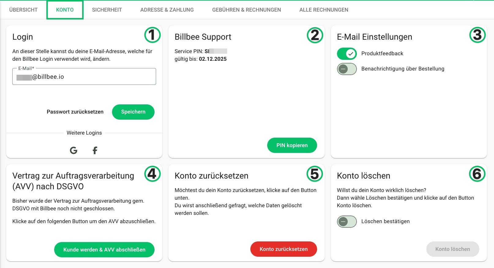 - AVV: Bist du noch in der Testphase, kannst du mit Klick auf den Button deinen Account aktivieren und damit Kunde/Kundin werden & den AVV abschließen. Bist du bereits zahlende:r Kunde/Kundin von Billbee kannst den AVV hier erneut herunterladen. Ein Muster unseres aktuellen AVVs findest du in unserem Hilfeartikel "Muster des AVVs".
