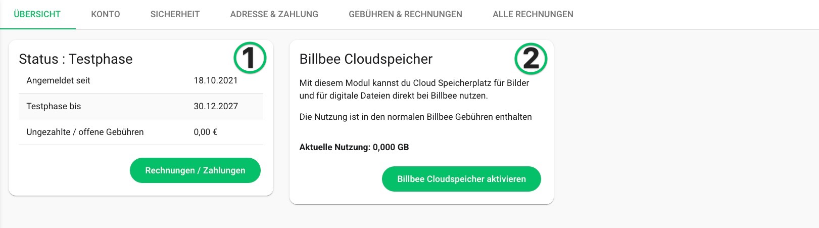 - Status: Du kannst hier sehen, ob du dich in der Testphase befindest oder dein Account aktiv ist. Außerdem werden dir deine ungezahlten / offenen Gebühren angezeigt.