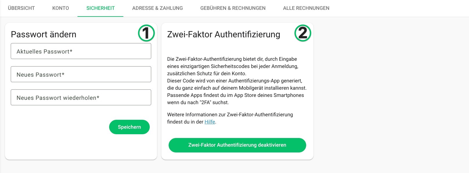 - Zwei-Faktor Authentifizierung: In dieser Kachel kannst du deine 2-Faktor Authentifizierung aktivieren oder zurücksetzen und neu vergeben. Alle Informationen dazu findest du in unserem Hilfeartikel "Zwei Faktor Authentifizierung (2FA)".