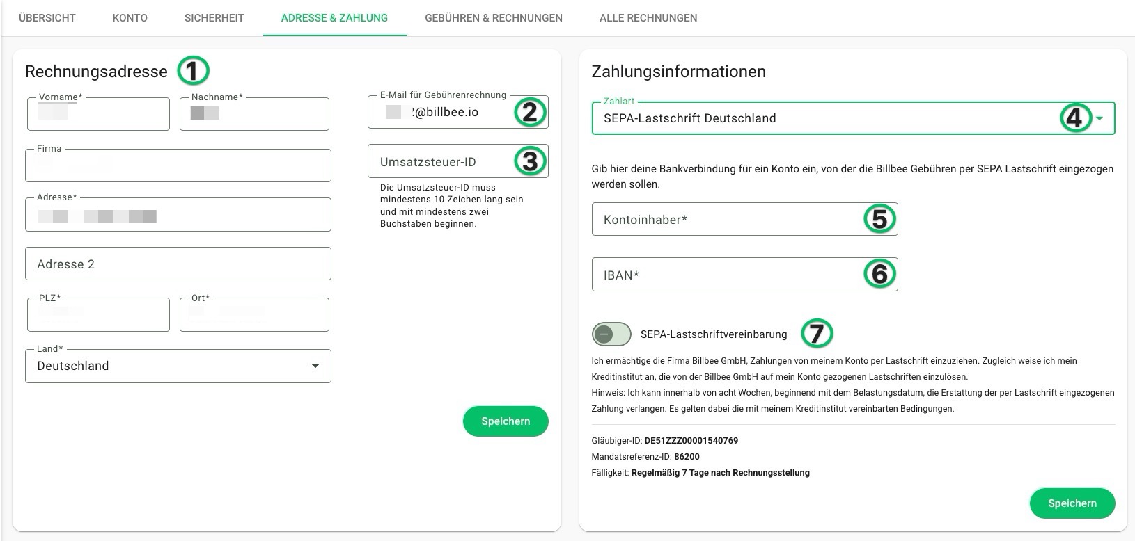 - Rechnungsadresse: Trage hier deine Rechnungsadresse für deine Billbee-Gebührenrechnungen ein.