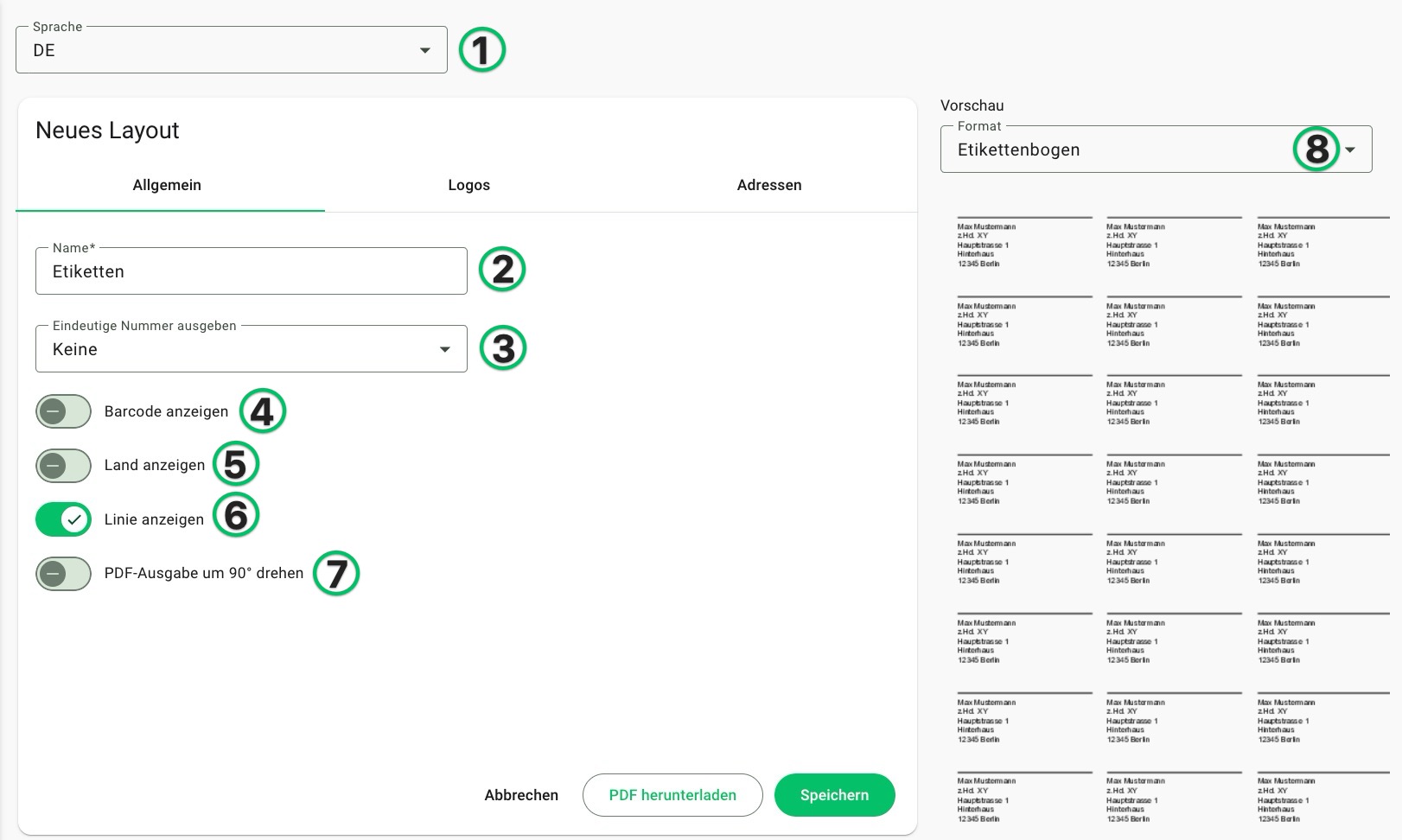- Format: Wähle hier über das Dropdown-Menü das Format (die Etikettenart) aus. Dieses Format gilt für die Etikettenvorschau beim Klicken des "Download PDF"-Button. Das richtige Format für deine Etiketten kannst du dann beim tatsächlichen Erzeugen der Etiketten auswählen.