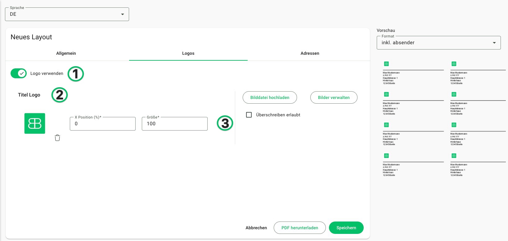 - X Position (%) / Größe: Hier kannst du mithilfe des linken Schiebereglers die Position deines Logos auf dem Dokument auswählen. Über den rechten Schieberegler kannst du die Größe deines Logos auswählen.