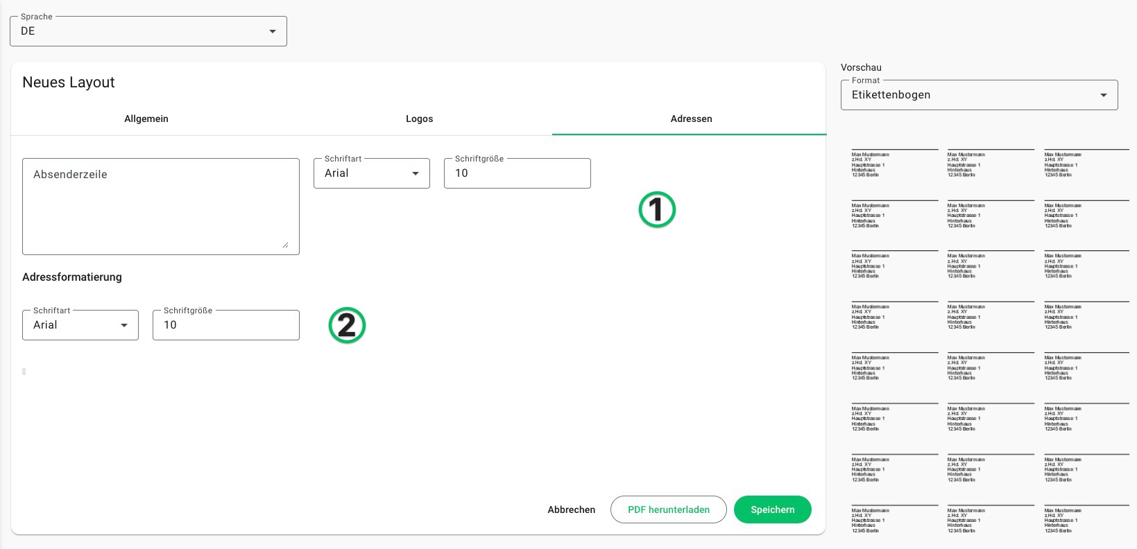 - Adressformatierung: Wähle die Schriftart und -größe der Empfängeradresse aus.