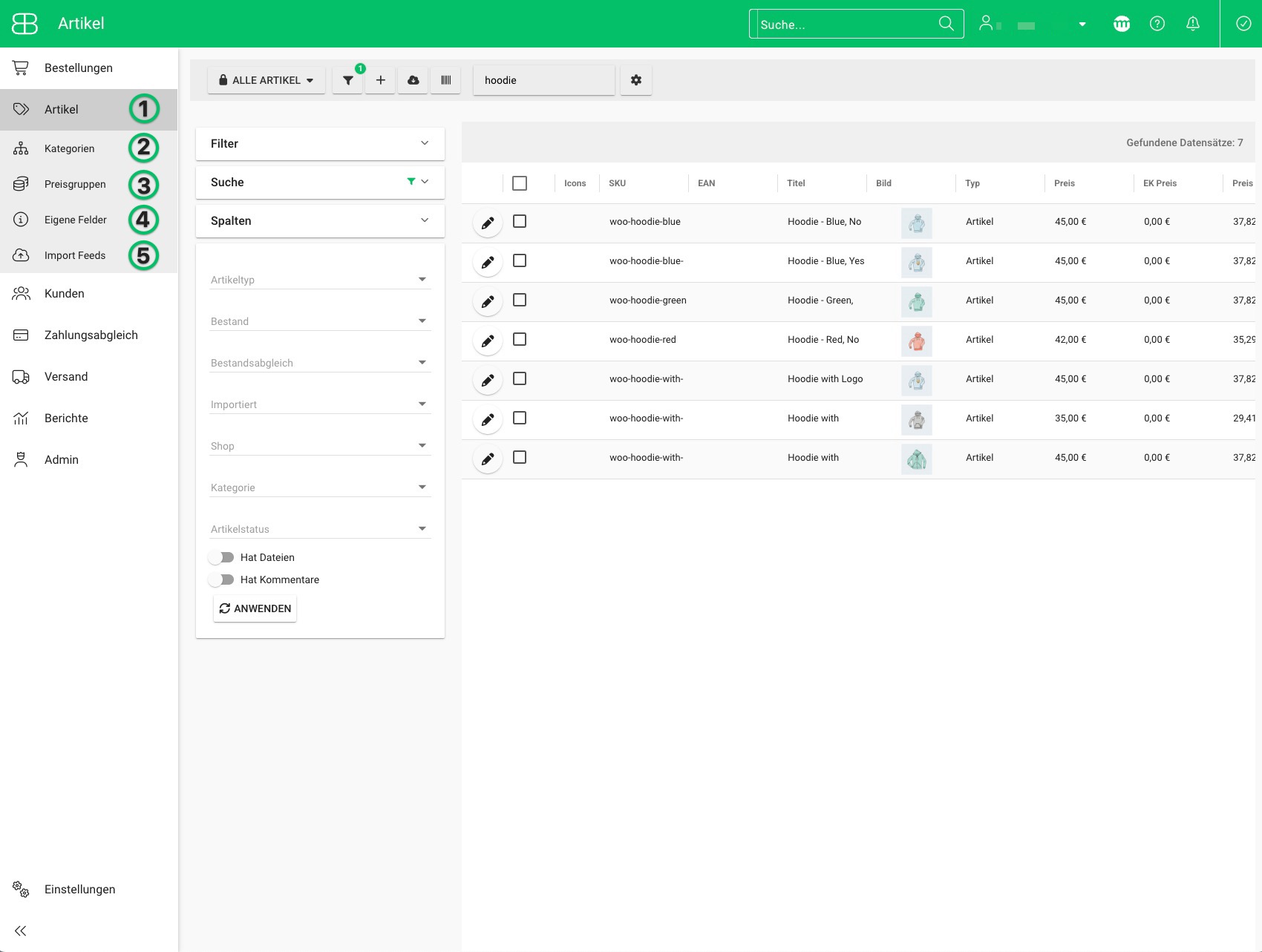 - Artikel: Kommst du von einem anderen Menü klickst du als erstes auf den Hauptmenüpunkt "Artikel". Damit öffnet sich die Artikelübersicht. In der linken Menüleiste zeigen sich außerdem weitere Untermenüs zum Hauptmenü "Artikel".