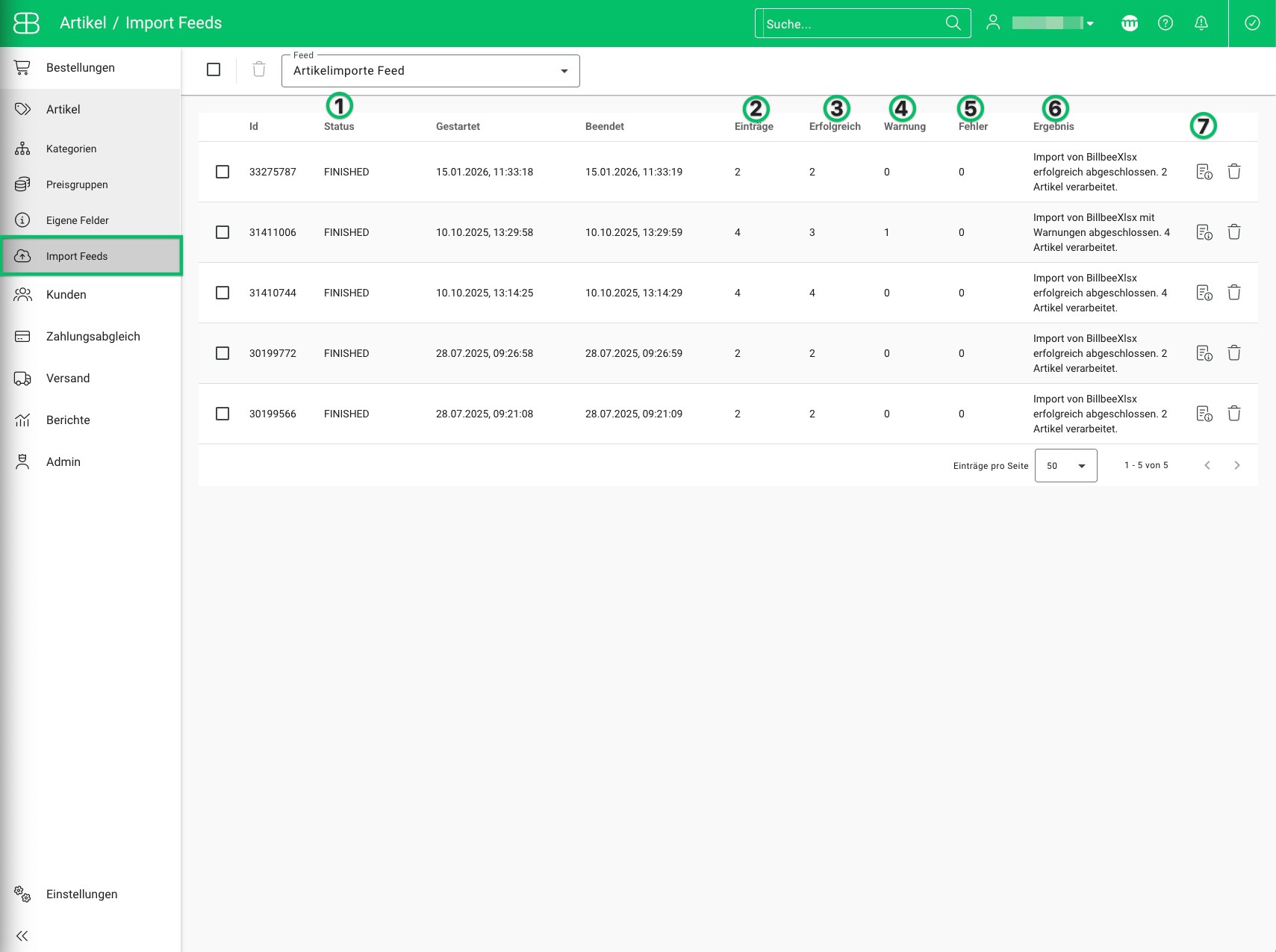 - Erfolgreich: In dieser Spalte siehst du, wieviele Artikel erfolgreich importiert werden konnten.
