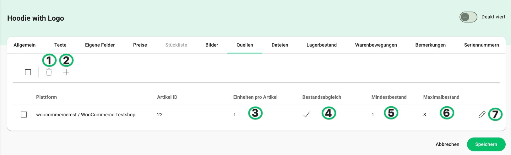 Du wirst voraussichtlich mit Billbee mehrere Shops oder Marktplätze verwalten, daher kann es sein, dass dein Artikel auch auf mehreren Kanälen online ist. Um Artikeldaten nicht doppelt pflegen zu müssen und nur einen Artikelbestand für die Lagerverwaltung vorzuhalten, ist es sinnvoll, dass bei Billbee ein Artikel nur einmal vorhanden ist, auch wenn er in verschiedenen Shops (mit verschiedenen Artikelnummern) verkauft wird. Daher kannst du in dem Reiter "Quellen" einen Datensatz für jeden Shop anlegen, in dem der Artikel verkauft wird.