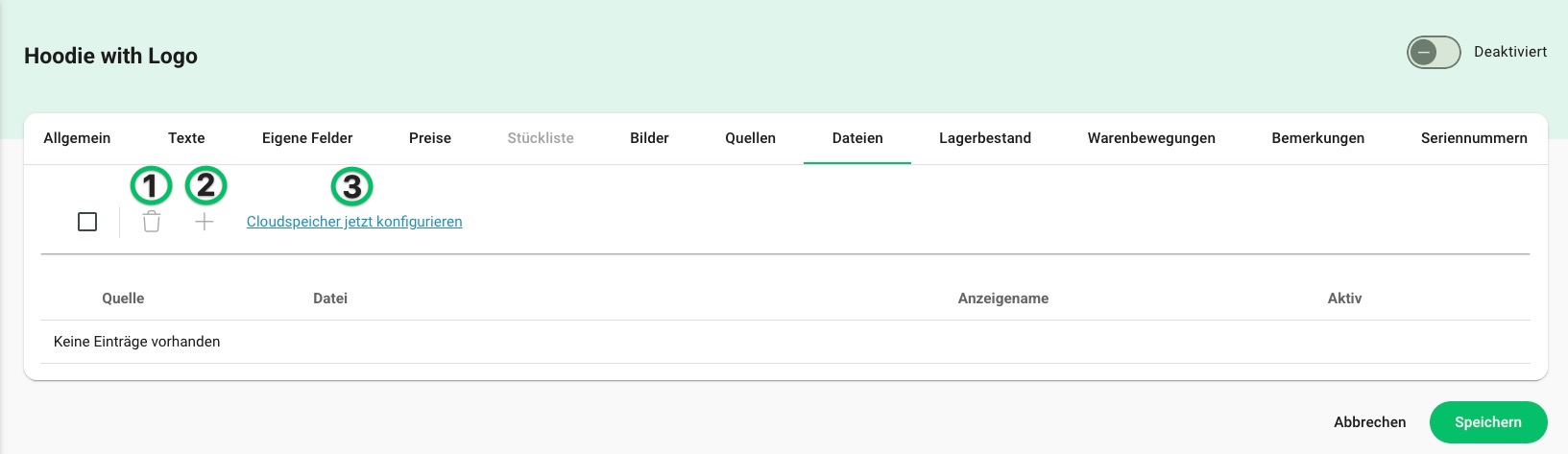 - Neue Datei: Über den Button kannst du eine neue Datei mit deinem Artikel verknüpfen. Du musst die gewünschte Datei vorher entweder in den Billbee-internen Cloudspeicher oder einen externen an Billbee angebundenen Cloudspeicher laden, um sie mit dem Artikel verknüpfen zu können.