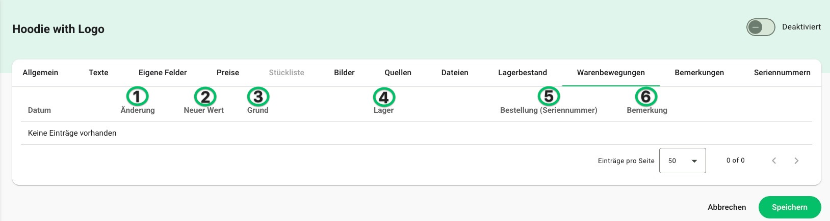 - Bemerkung: Gib hier eine Bemerkung zu der Bestandsänderung ein, welche dann im Reiter "Warenbewegungen" erscheint.