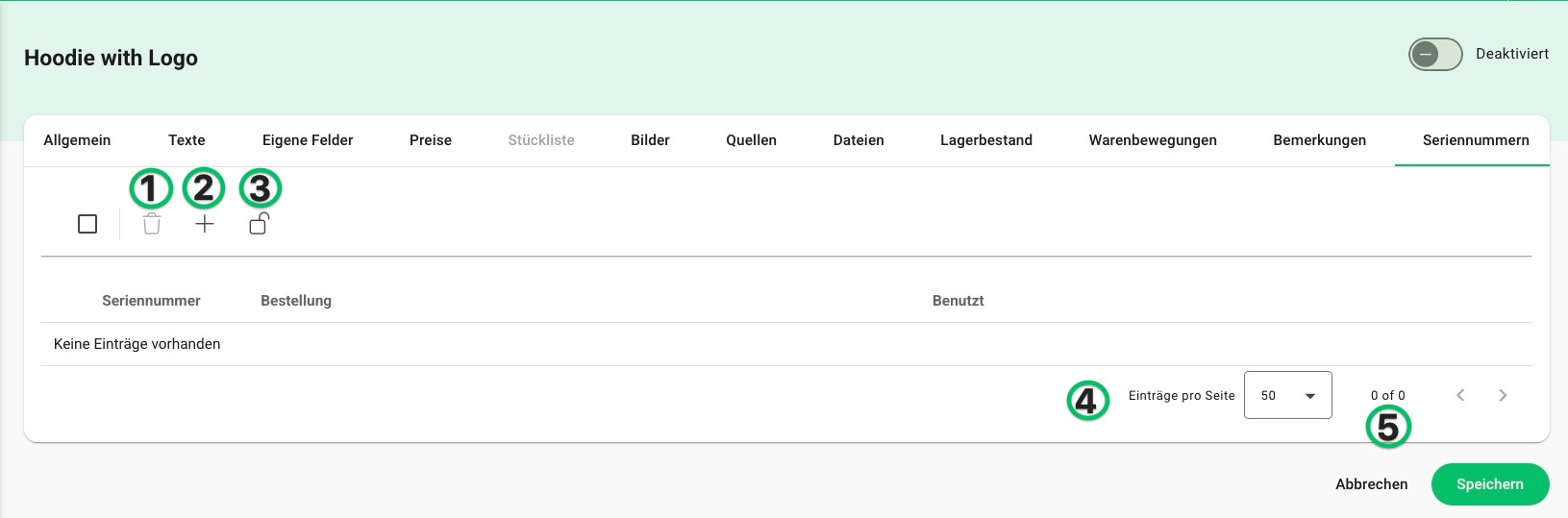 Der Reiter "Seriennummern" dient dazu, dass du Produkte mit Seriennummern (z. B. technische Komponenten) verwalten kannst. Mehr zum Thema Seriennummern kannst du hier finden.