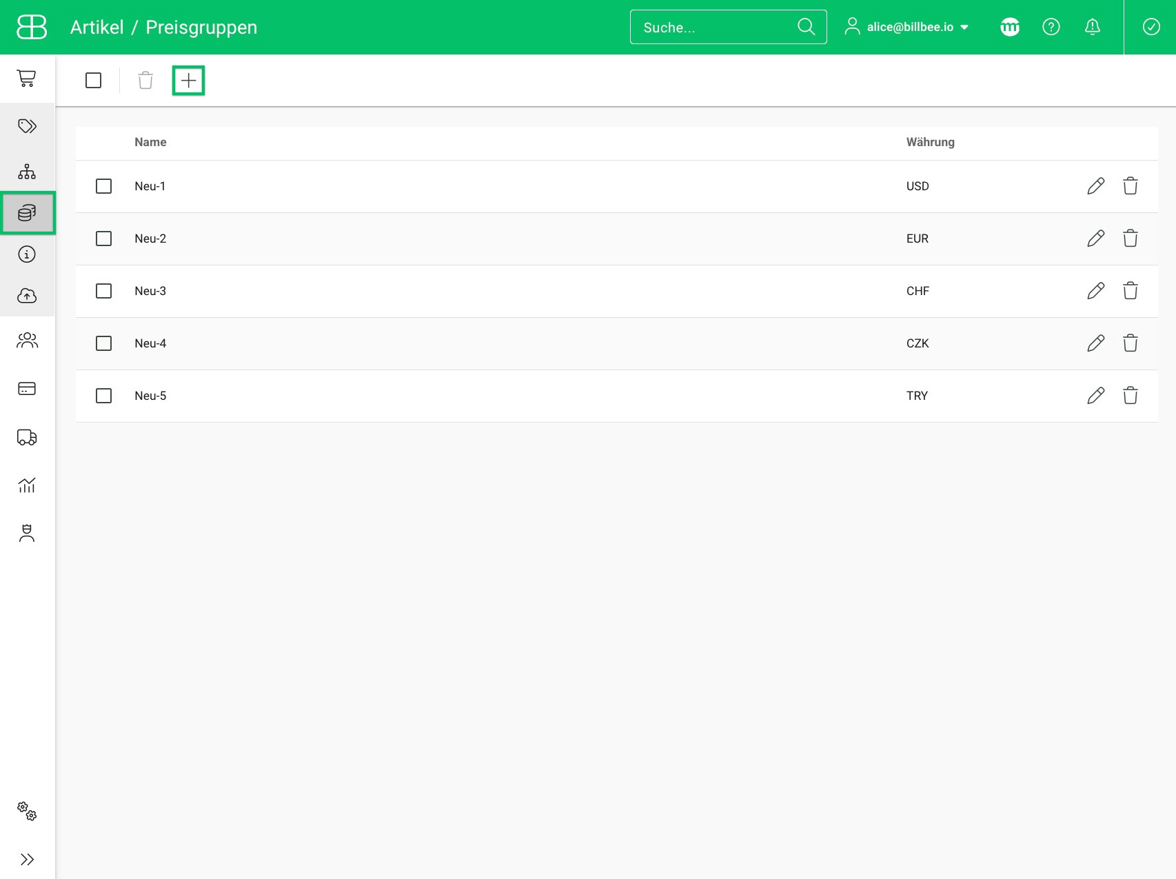 Unter Artikel / Preisgruppen kannst du mit dem Button "Neu" eine neue Preisgruppe anlegen. Dort gibst du einen Namen für deine neue Preisgruppe ein und wählst die Währung für die Preisgruppe aus.
