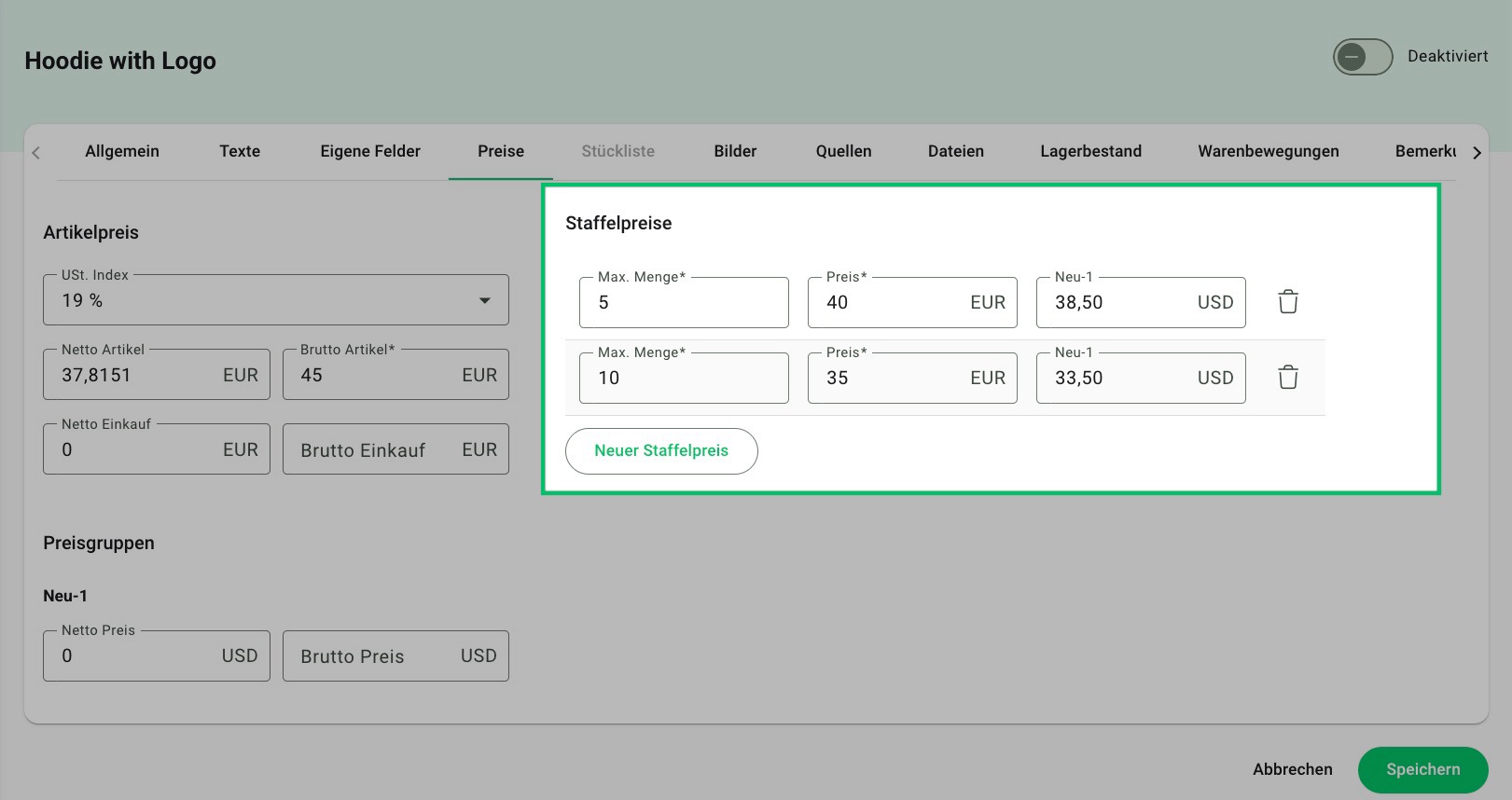 - Neuer Staffelpreis: Für einen Artikel muss nicht immer ein fester Preis angegeben werden, denn die Preisgestaltung kann auch über Staffelpreise gelöst werden. Über diesen Button kannst du einen neuen Staffelpreis hinterlegen.