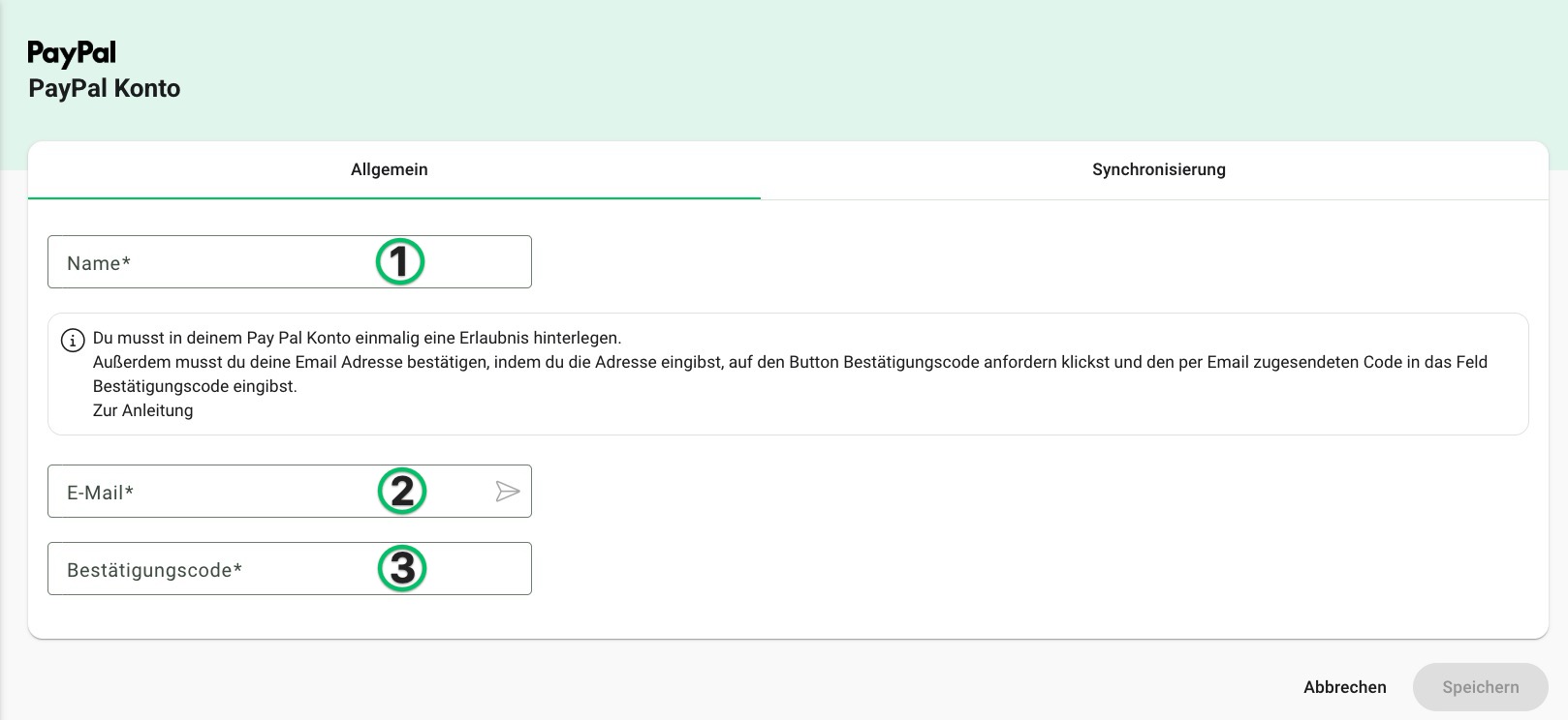 - Name: Gib einen internen Namen für deine PayPal-Kontoverbindung an.