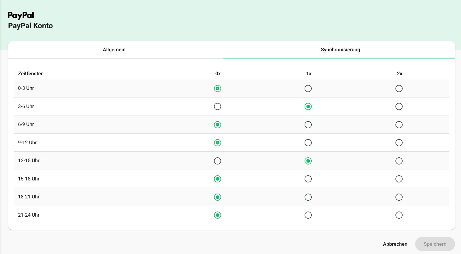 Nachdem du alles korrekt eingegeben hast, kannst du deine Verbindung speichern, denn dann wird der ausgegraute "Speichern"-Button grün. Du musst aber auch noch die Synchronisierungshäufigkeit einstellen. Gehe dafür in den Reiter "Synchronisierung". In dieser Matrix kannst du sehen, dass der Tag in 8 gleich große Zeitfenster geteilt ist, die jeweils 3 Stunden umfassen. Innerhalb dieser Zeitfenster hast du dann folgende Auswahlmöglichkeiten, um die Abstände der Synchronisierung zu wählen: