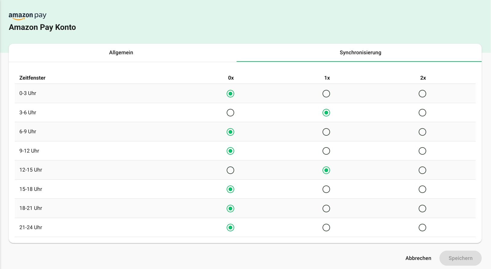 Nachdem du alles korrekt eingegeben hast, kannst du deine Verbindung speichern, denn dann wird der ausgegraute "Speichern"-Button grün. Du solltest zudem noch die Synchronisierungshäufigkeit anpassen. Gehe dafür in den Reiter "Synchronisierung". In dieser Matrix kannst du sehen, dass der Tag in 8 gleich große Zeitfenster geteilt ist, die jeweils 3 Stunden umfassen. Innerhalb dieser Zeitfenster hast du dann folgende Auswahlmöglichkeiten, um die Abstände der Synchronisierung zu wählen: