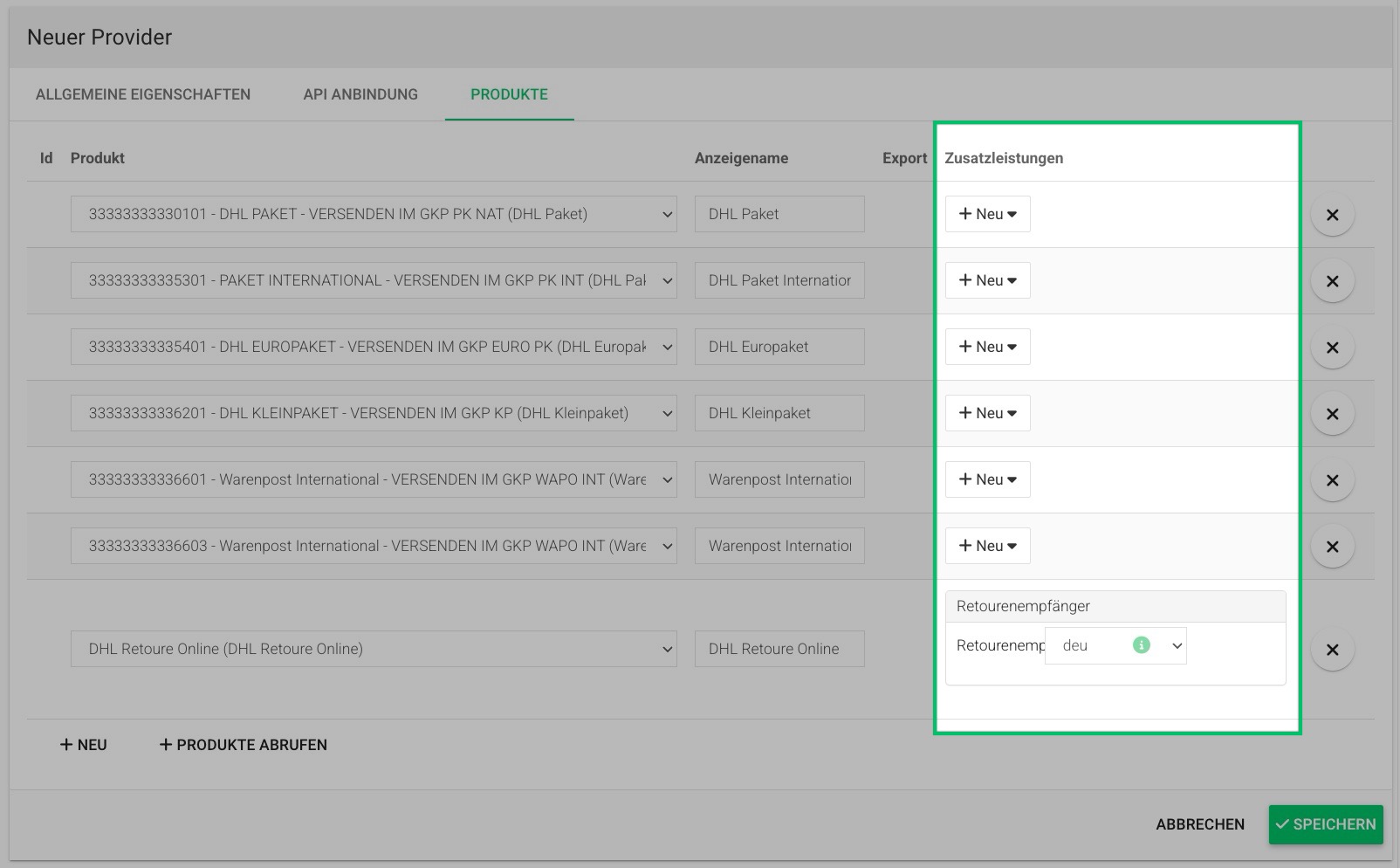 Über den Button "Neu" in der Spalte "Zusatzleistungen" fügst du den Service "Rücksendeetikett erzeugen" hinzu: