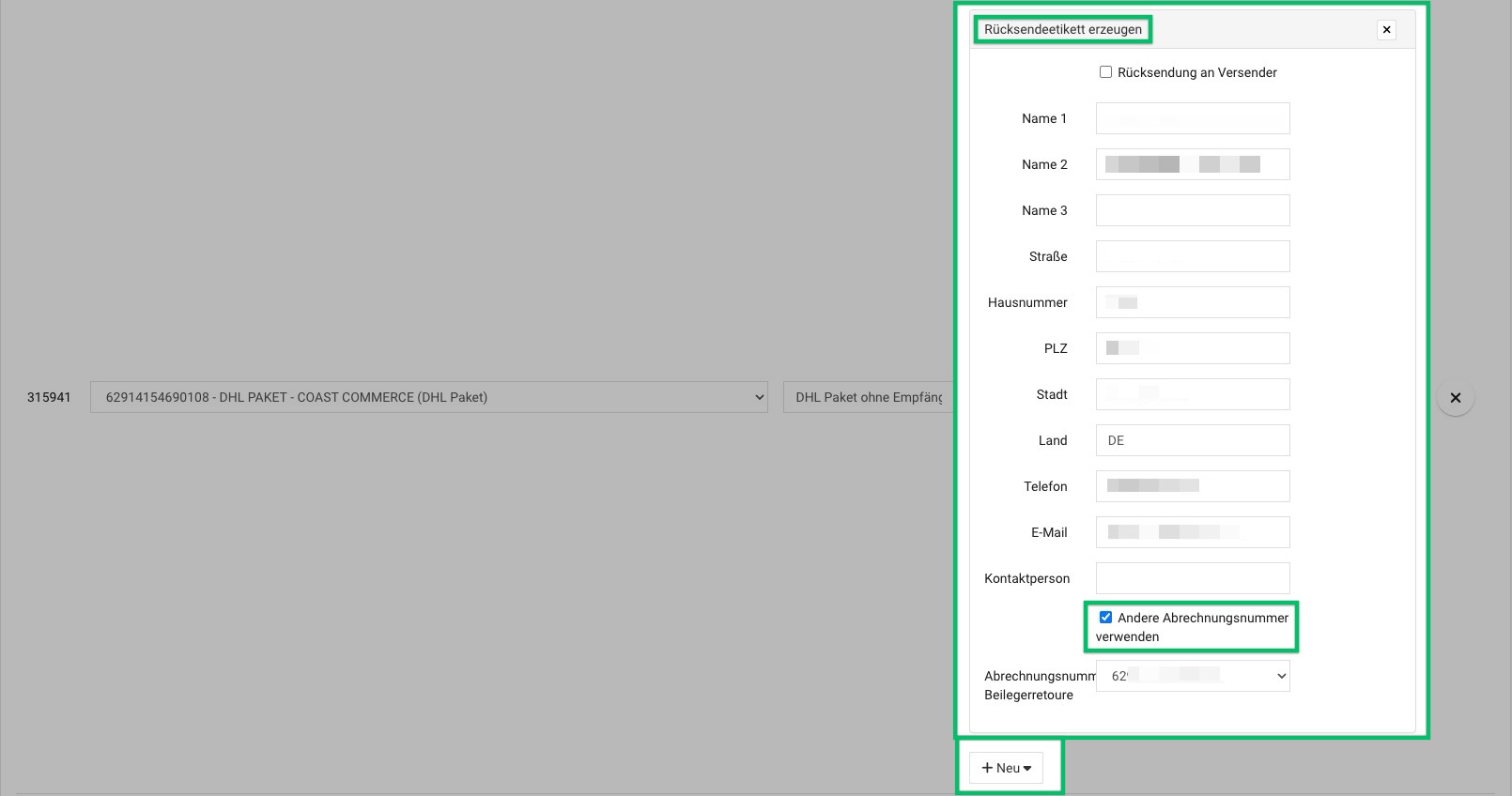 - Rücksendeetikett erzeugen (inkl. Abweichender Abrechnungsnummer)