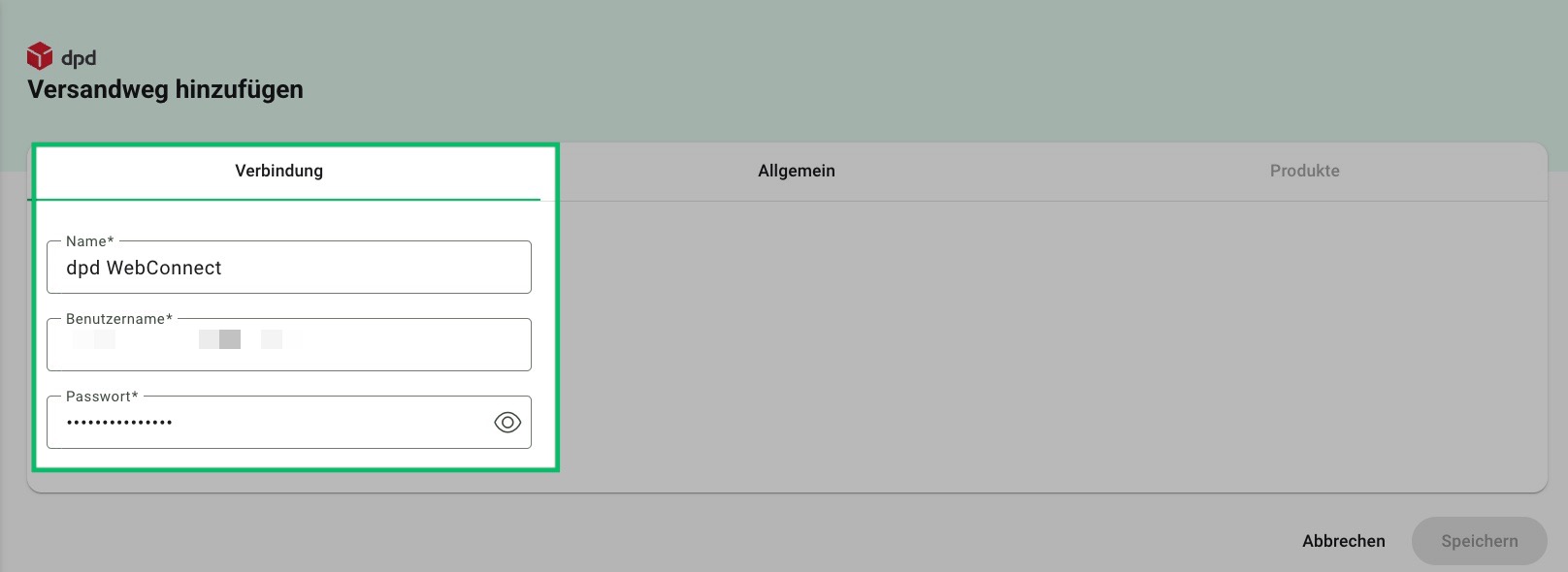 Im Reiter 'Verbindung' musst du zuerst einen Namen für deine Versandanbindung hinterlegen, sowie Zugangsdaten zum DPD WebConnect Service.