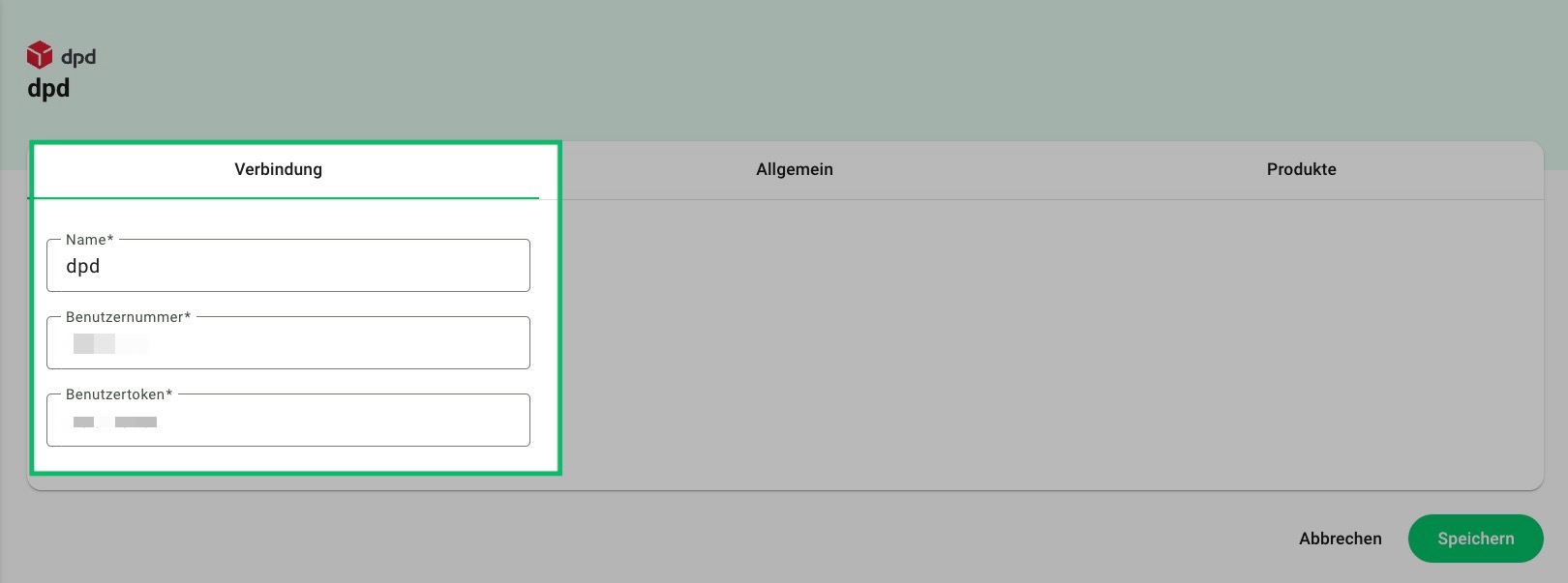Jetzt öffnet sich ein Pop-Up Fenster, in welchem du auf die Kachel "DPD Cloud / SME Kunden" klickst. Im Reiter 'Verbindung' musst du einen Namen für deine Versandanbindung hinterlegen, sowie deine Benutzernummer und dein Benutzertoken.