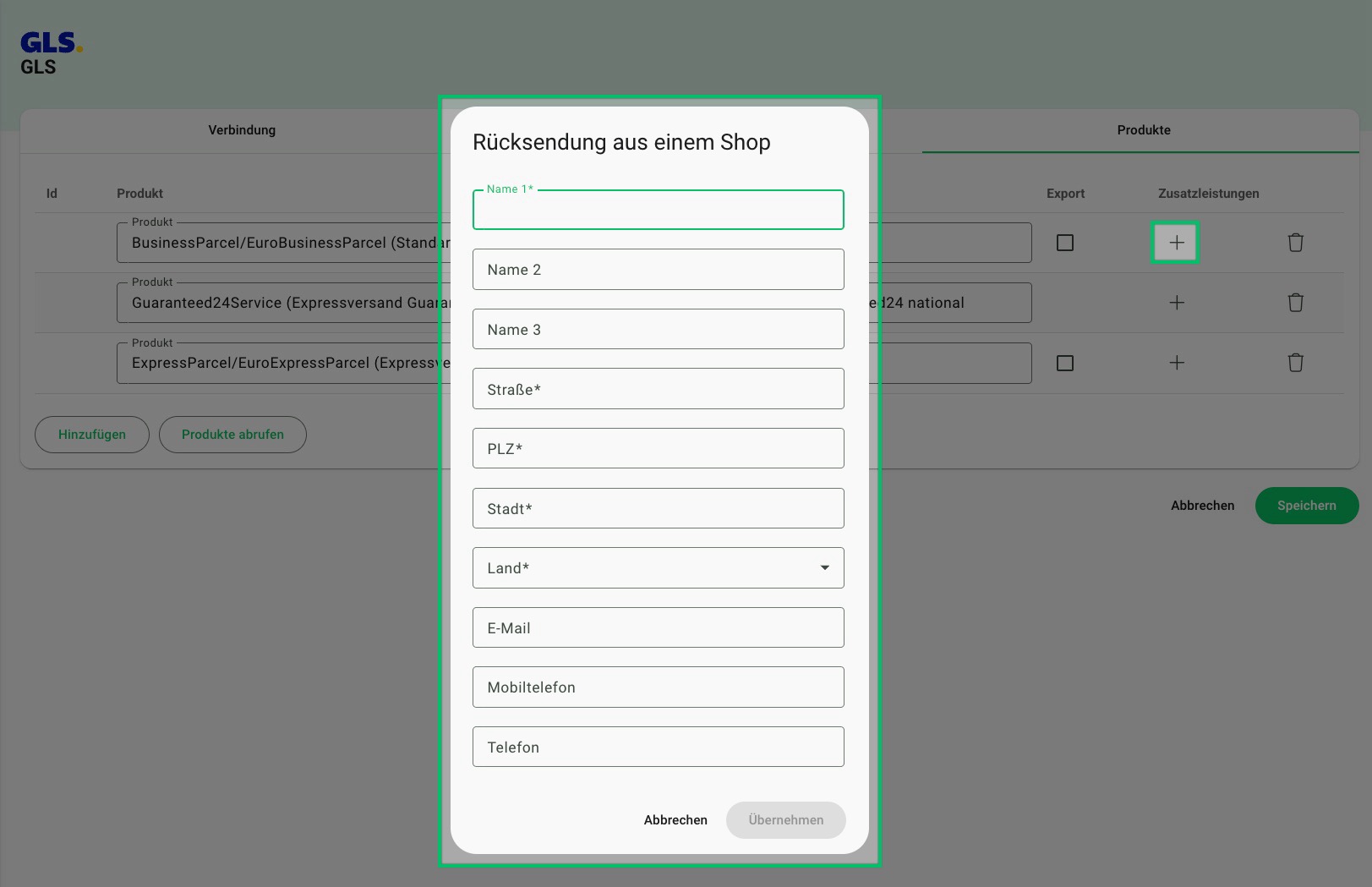 Du kannst mittels GLS ein Versandlabel zusammen mit einem Retourenlabel erzeugen. Dafür musst du unter dem Reiter 'Produkte' deinem hinterlegten Versandprodukt die entsprechende Zusatzleistung hinzufügen. Diese Zusatzleistung nennt sich in Billbee "Rücksendung aus einem Shop". Wählst du diese Zusatzleistung aus, musst du noch die entsprechende Empfängeradresse der Retoure eintragen: