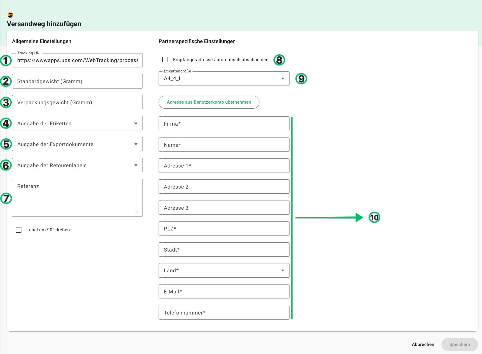 - Empfängeradresse automatisch abschneiden: Lege fest, ob sehr lange Empfängeradressen auf dem Versandlabel automatisch abgeschnitten werden sollen.