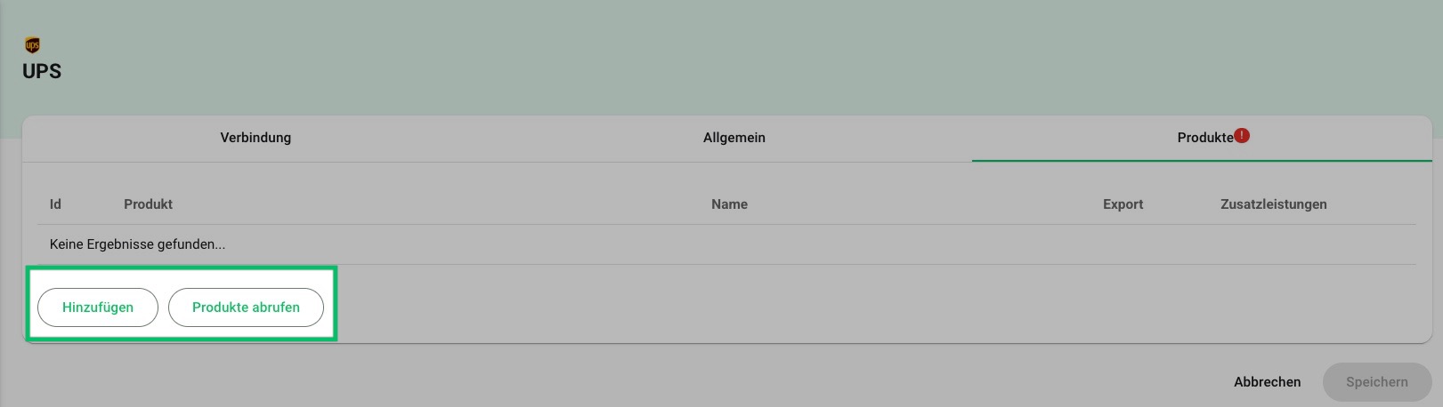 Hast du alle Informationen eingegeben, dann klicke unten auf den Button "Speichern". Ist die Konfiguration erfolgreich, erhältst du eine Benachrichtigung darüber und der Reiter "Produkte" wird aktiviert. Jetzt kannst du dort deine Versandprodukte anlegen. Das geht am einfachsten, wenn du im Reiter "Produkte" auf den Button "Produkte abrufen" klickst, denn so werden die von UPS angebotenen Versandprodukte automatisch abgerufen und deiner Versandanbindung hinzugefügt. Über den Button "Hinzufügen" kannst du auch manuell über ein Dropdown-Menü ein Versandprodukt anlegen. Der Anzeigename kann dabei frei vergeben werden.