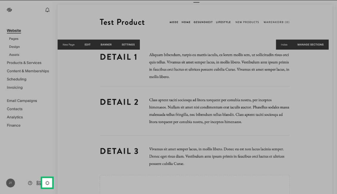 Damit du deinen Squarespace-Shop an deinen Billbee-Account anbinden kannst, benötigst du einen API-Key. Diesen musst du in den Einstellungen deines Shops generieren. Gehe dazu in die Einstellungen deines Squarespace-Shops und klicke unten links auf das Zahnrad: