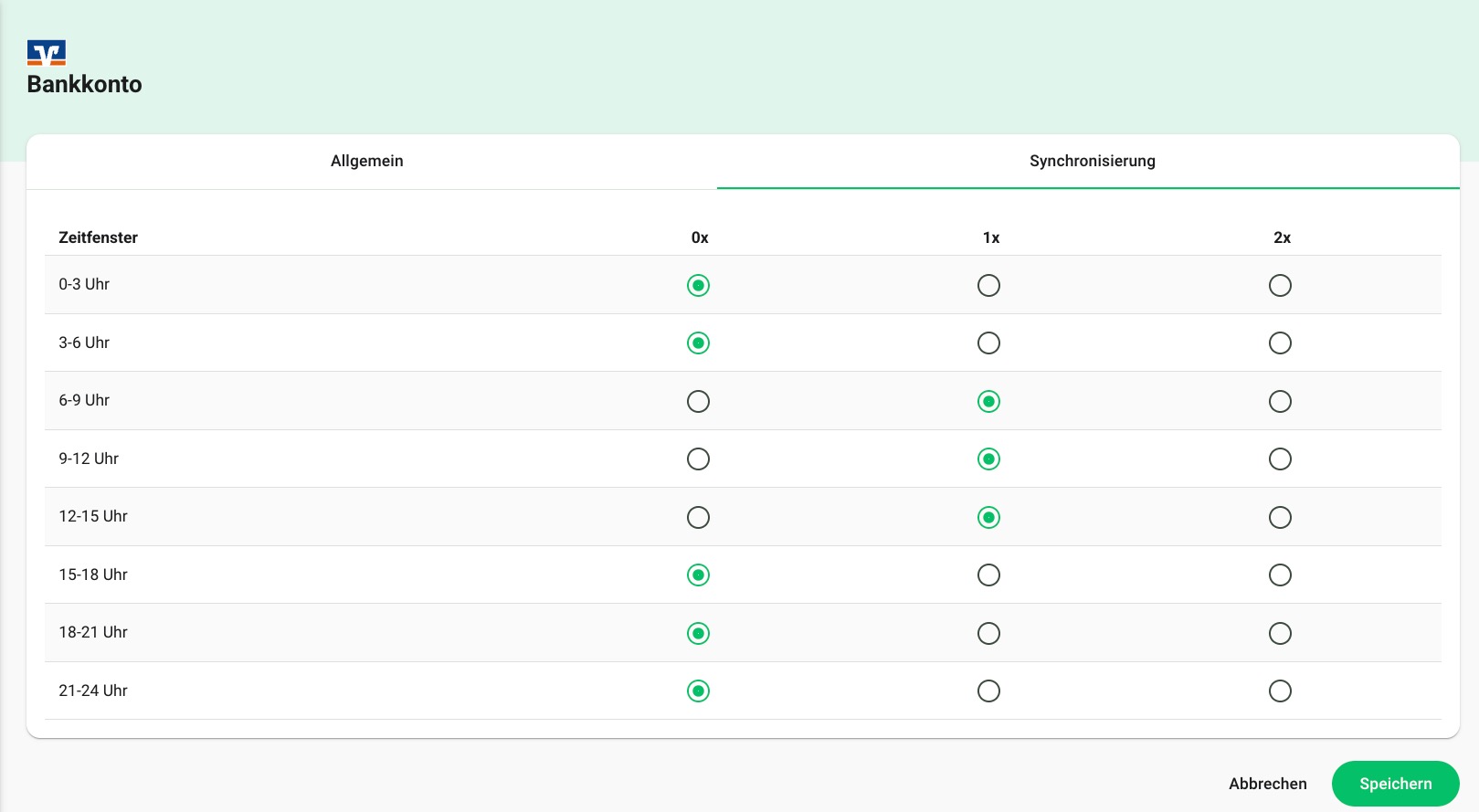 Da manche Banken nur eine bestimmte Anzahl an Abrufen pro Tag zulassen, kann es auch manchmal helfen, wenn du die Synchronisierung deines Bankkontos etwas einschränkst. Klicke dazu unter Einstellungen / Zahlungsabgleich den "Bearbeiten"-Button (Stiftsymbol) deiner Kontoverbindung. Anschließend wechselst du in den Reiter "Synchronisierung", wo du die Synchronisierungsintervalle einstellen kannst. Wir empfehlen, die Synchronisierung dann auf nur ein oder zweimal pro Tag einzustellen. In dieser Matrix kannst du sehen, dass der Tag in 8 gleich große Zeitfenster geteilt ist, die jeweils 3 Stunden umfassen. Innerhalb dieser Zeitfenster hast du dann folgende Auswahlmöglichkeiten, um die Abstände der Synchronisierung zu wählen: