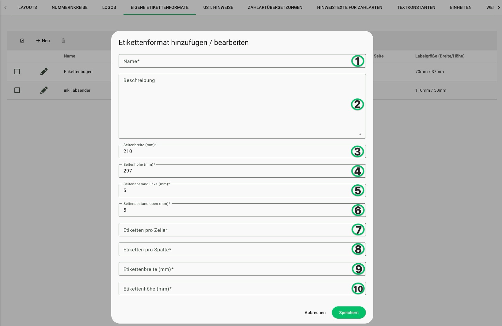 Gibst du unter Punkt 7 & 8 jeweils die Zahl "1" ein, dann erstellst du ein Format für ein einzelnes Etikett. Gibst du jeweils eine größere Zahl an, dann gilt das Format für einen Etikettenbogen. Legst du ein Format für einen Etikettenbogen an, kannst du später beim Erzeugen eines Etikettes über die Bestellübersicht die Startposition individuell anpassen.